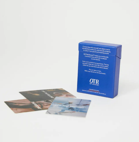 We're not lonely. We're simply not having conversations that matter. Founded in 2023, Off The Record develops the tools that get people talking for real. Each card contains a pair of thought-provoking questions.